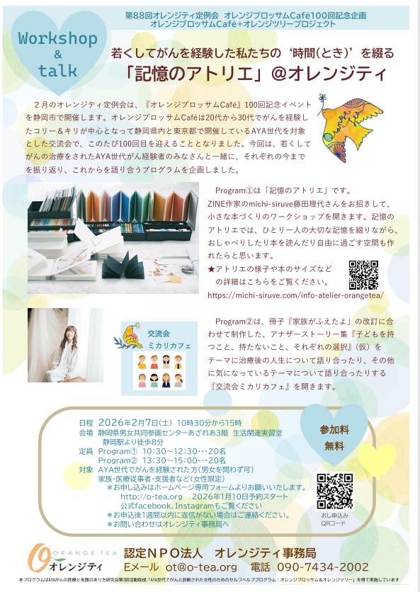 次回のオレンジティ定例会は、AYA世代でがんを経験した方の交流会オレンジブロッサムcafe100回記念企画です🐤