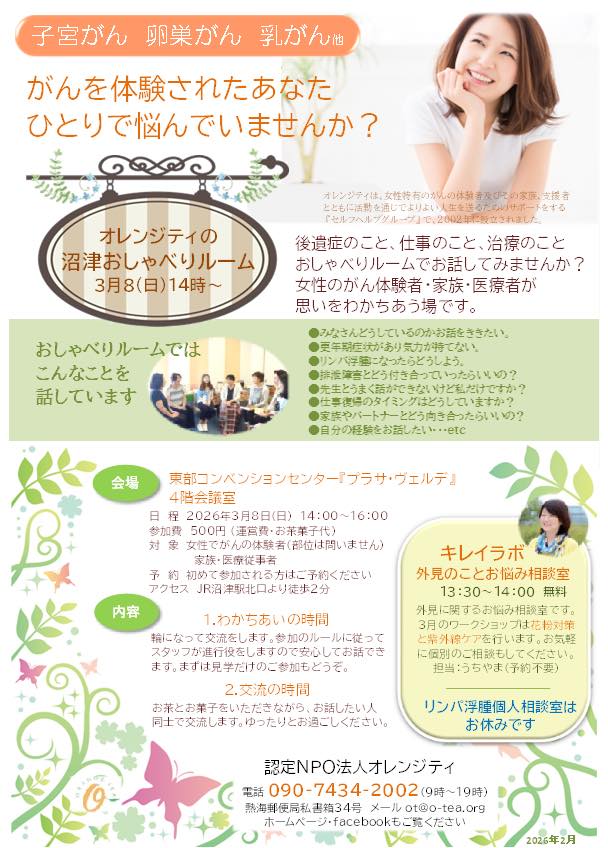 おしゃべりルームは、治療前や治療中、治療後までお立場に関係なく、初めての方もご参加いただけます。今回もキレイラボ企画の『外見ケアの相談会』も開催します✨